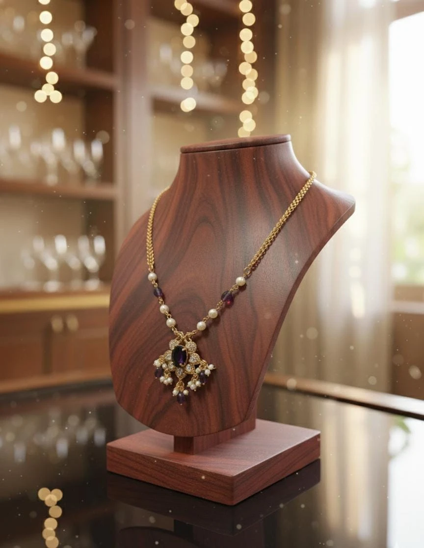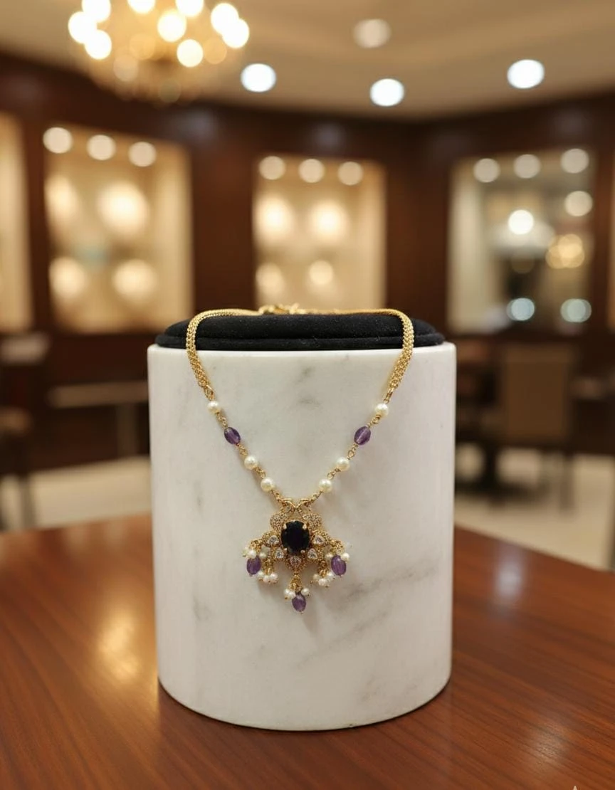 Exquisitely crafted, this elegant gold-finish pendant necklace features a striking deep-purple amethyst stone at the center, surrounded by sparkling crystal accents. Delicate pearls and faceted amethyst drops add graceful movement and a touch of royal charm. Perfect for weddings, festive occasions, and evening wear, this timeless piece beautifully complements both traditional and contemporary outfits.