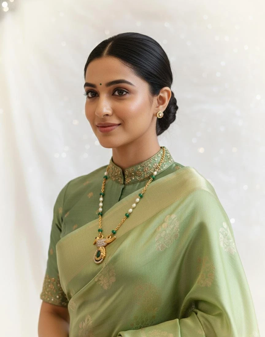 The chain is delicately detailed with alternating green beads and pearl accents, enhancing its traditional charm. Lightweight and graceful, this necklace is perfect for festive occasions, poojas, weddings, and special events. It pairs beautifully with sarees and ethnic outfits, making it a standout accessory for a refined traditional look. 🌸