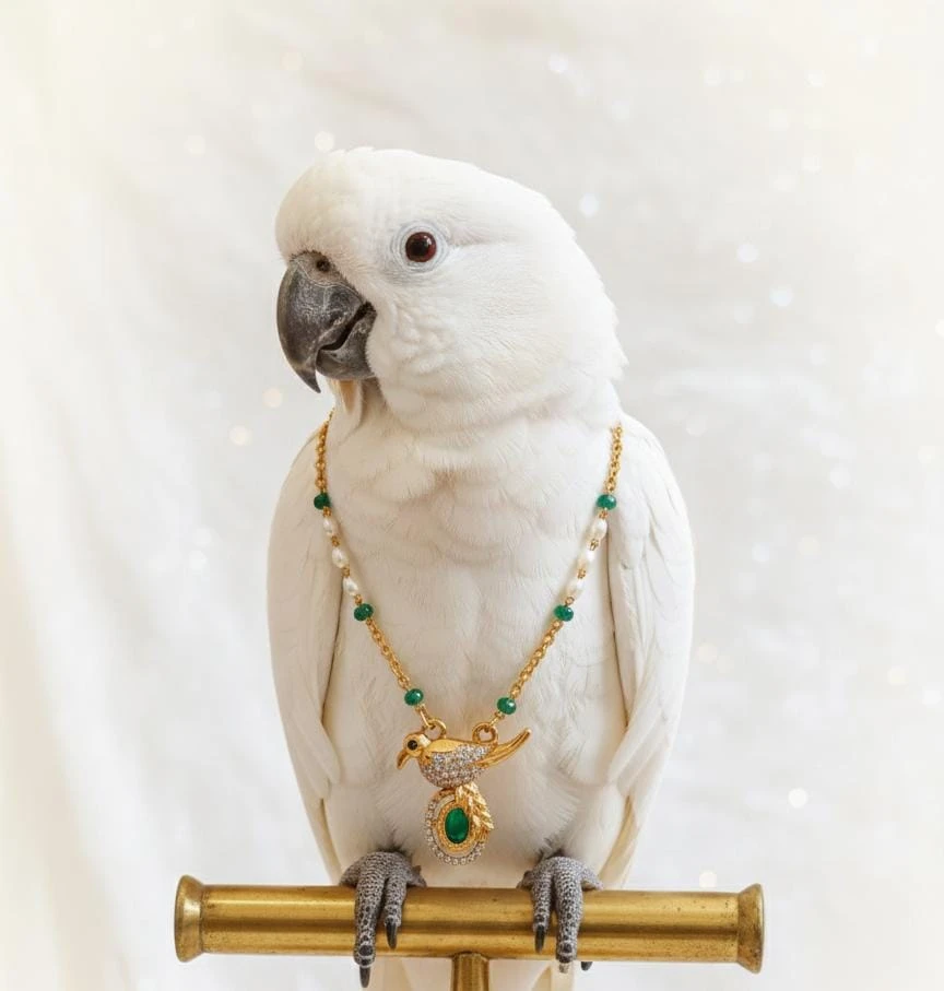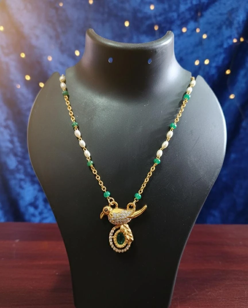 Add a unique touch of elegance to your jewellery collection with this antique gold finish pigeon pendant chain. ✨ The beautifully crafted bird-inspired pendant is adorned with sparkling stones and a rich green stone drop, symbolizing peace, grace, and harmony.