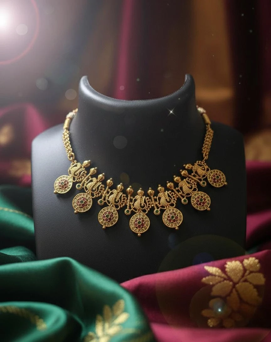 The antique gold polish gives it a timeless, temple-jewellery look, making it perfect for weddings, festivals, poojas, and cultural celebrations. Lightweight and comfortable, this necklace pairs effortlessly with silk sarees and ethnic wear for a graceful and royal finish. 🌸