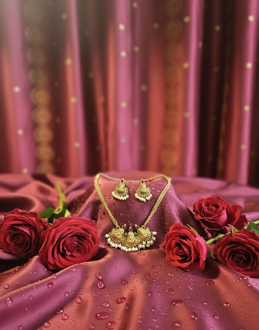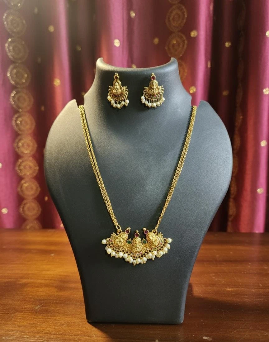 Paired with matching Lakshmi motif earrings, this set is perfect for weddings, poojas, festivals, and special occasions. Designed to offer a rich temple-jewellery look with comfortable wear, it pairs wonderfully with silk sarees and classic ethnic outfits for a timeless and auspicious style. 🌸