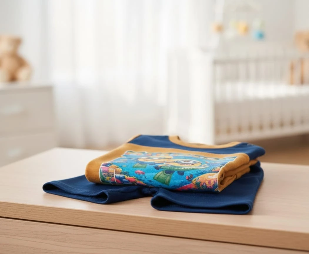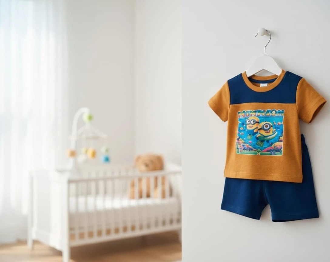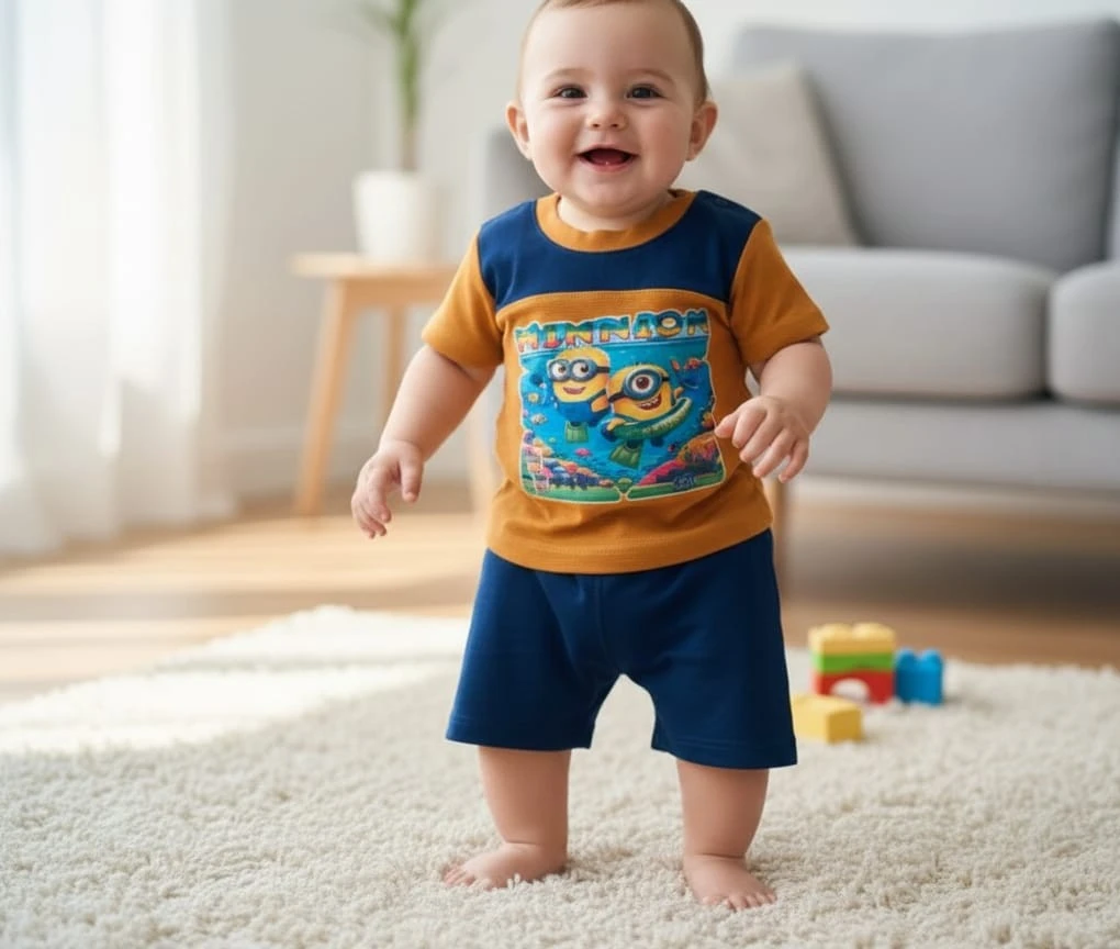 Adorable baby boys’ outfit featuring a soft mustard yellow cartoon-printed T-shirt paired with navy blue shorts. Designed for comfort and easy movement, perfect for playtime and everyday wear.