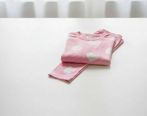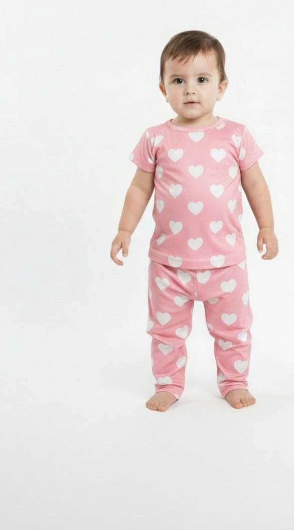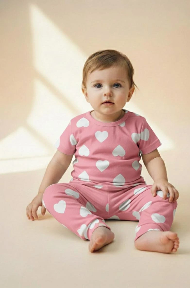 A soft and comfortable babywear set featuring a pink base with cute white heart prints, perfect for everyday wear and all-day comfort.