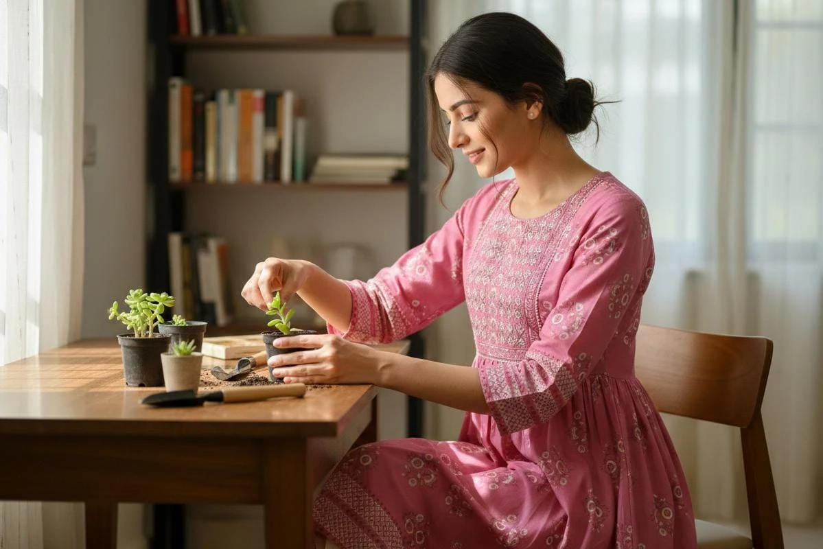 Step into graceful charm with this baby pink Anarkali dress, adorned with delicate all-over prints and a beautifully embroidered yoke. The softly flared silhouette offers elegant movement, while the three-quarter sleeves and contrasting hem border add a refined traditional touch. Perfect for festive occasions, cultural events, or daytime celebrations, this dress blends comfort with timeless ethnic style. Pair it with statement earrings and flats or heels for a polished, elegant look.