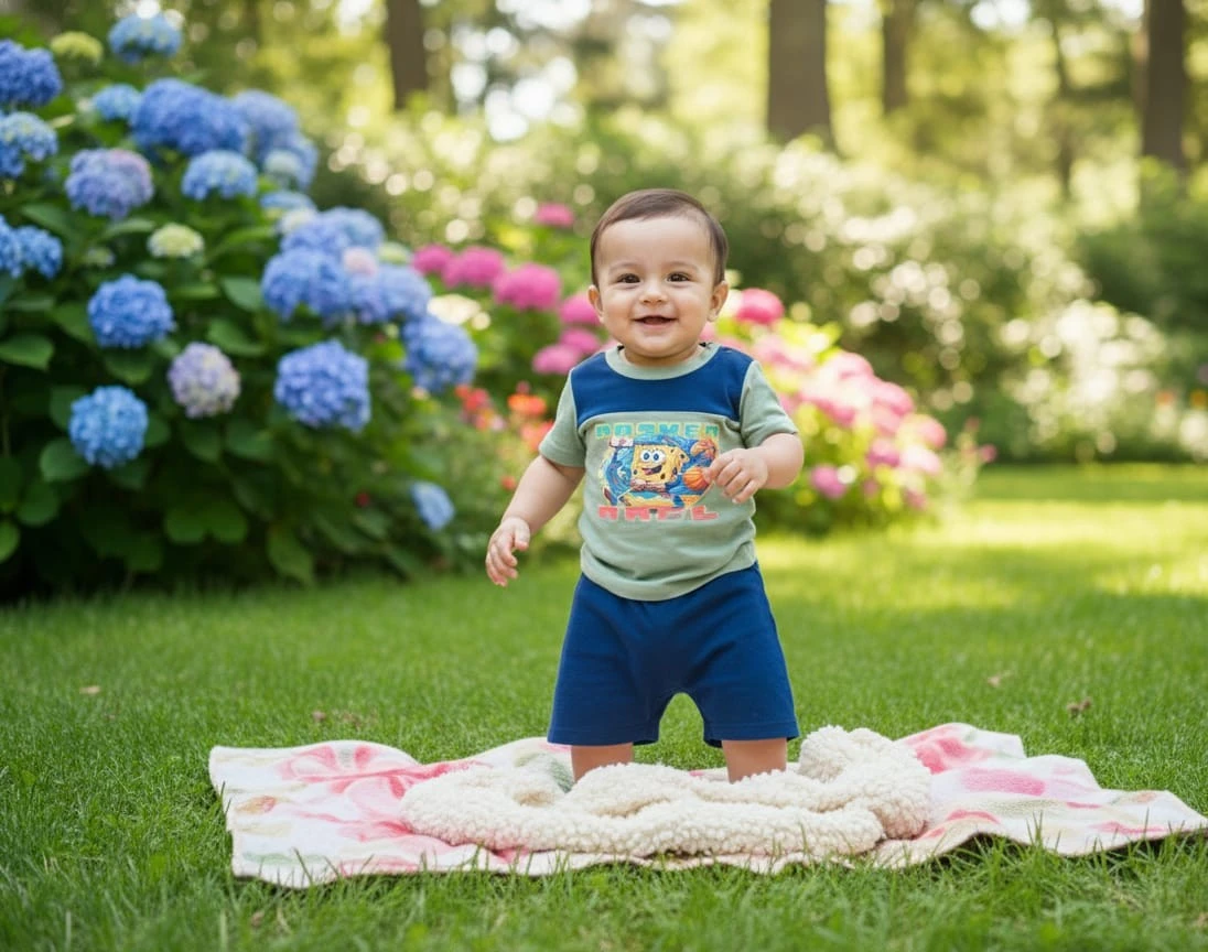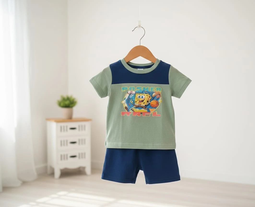Fun and comfortable boys’ outfit featuring a mint green cartoon-printed T-shirt paired with navy blue shorts. Crafted from soft, breathable fabric, perfect for playtime, outings, and everyday wear.