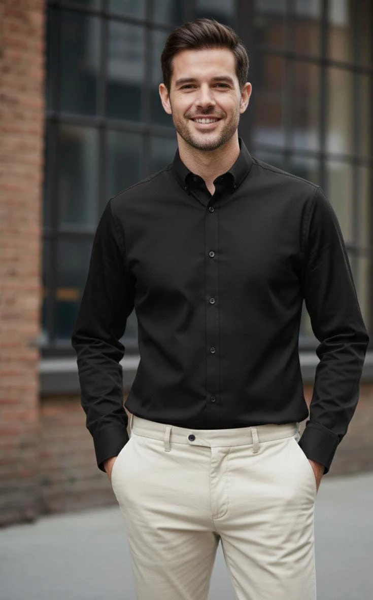 Elevate your style with this classic black linen shirt, crafted for a sleek look and breathable comfort. Made from premium linen fabric, it offers a lightweight feel while maintaining a sharp, tailored silhouette. Designed with a classic collar, full-button front, and long sleeves, this versatile shirt pairs effortlessly with trousers or jeans—perfect for office wear, evening outings, or smart-casual occasions.