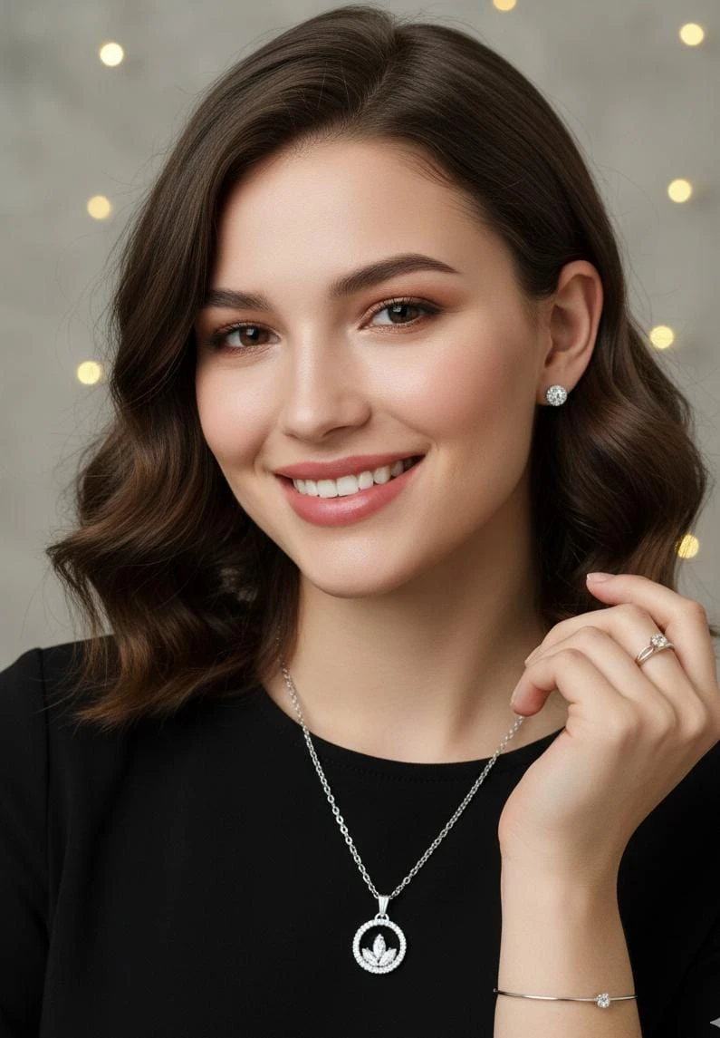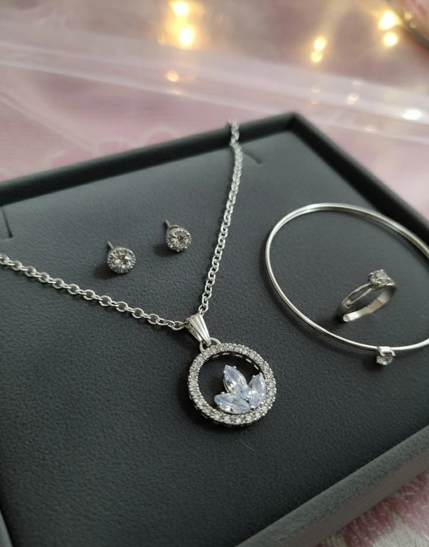 A refined silver-finish set featuring a crystal pendant necklace, matching studs, bracelet, and ring. Perfect for daily elegance and classy special-occasion wear.