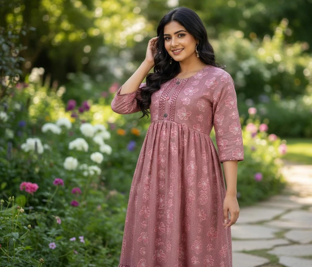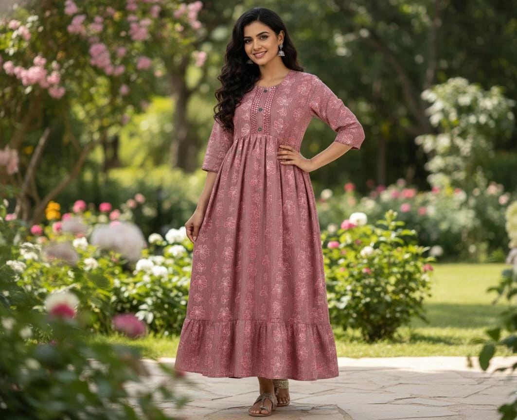 Elevate your everyday ethnic style with this elegant dusty rose long kurti dress, adorned with delicate floral prints. Designed with an empire waist and soft gathers, it offers a flattering, flowy silhouette. The front button placket adds a classic touch, while the three-quarter sleeves and tiered hem bring graceful movement—perfect for casual outings, festive days, or comfortable all-day wear. Crafted to blend