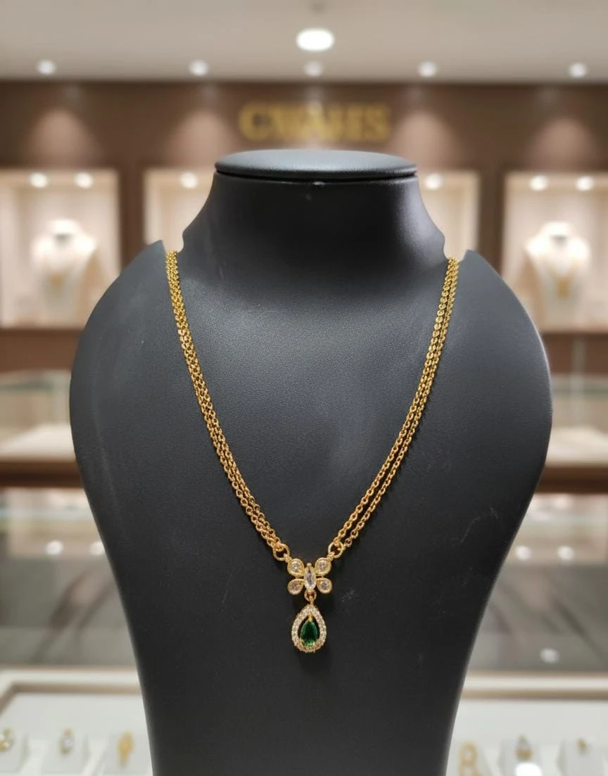 A refined gold-finish necklace featuring a delicate double-link chain and a graceful emerald-green drop pendant accented with sparkling stones. Designed to add subtle luxury to festive wear, weddings, and elegant everyday looks. Timeless, feminine, and easy to style.