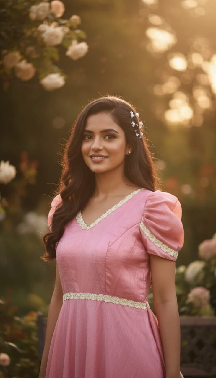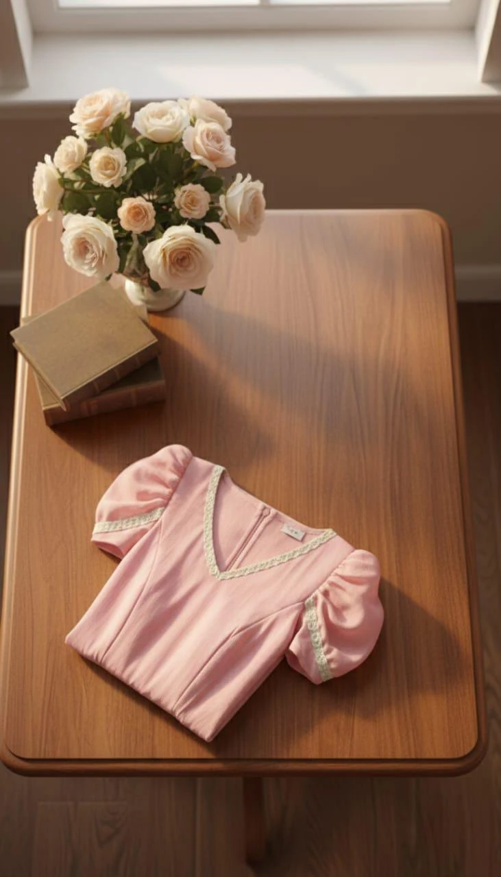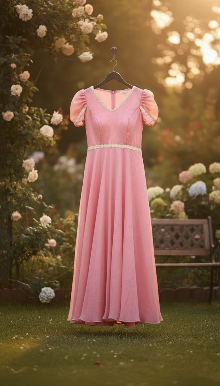 ELEGANT PINK DRESS FUTURES PUFFY SLEEVES A" V "NECKLINE PINK GOWN