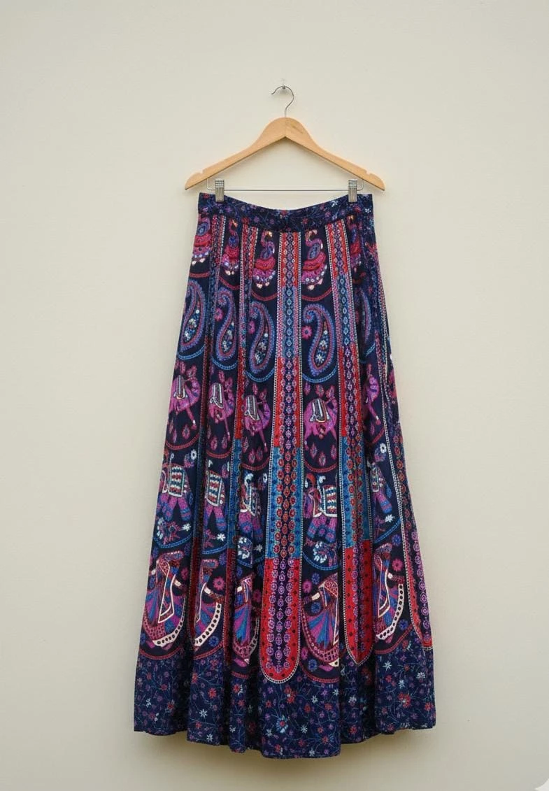 Elegant flared long skirt, All-over ethnic Kalamkari-style print, Panel-style vertical design for graceful fall, Comfortable waistband with neat finish