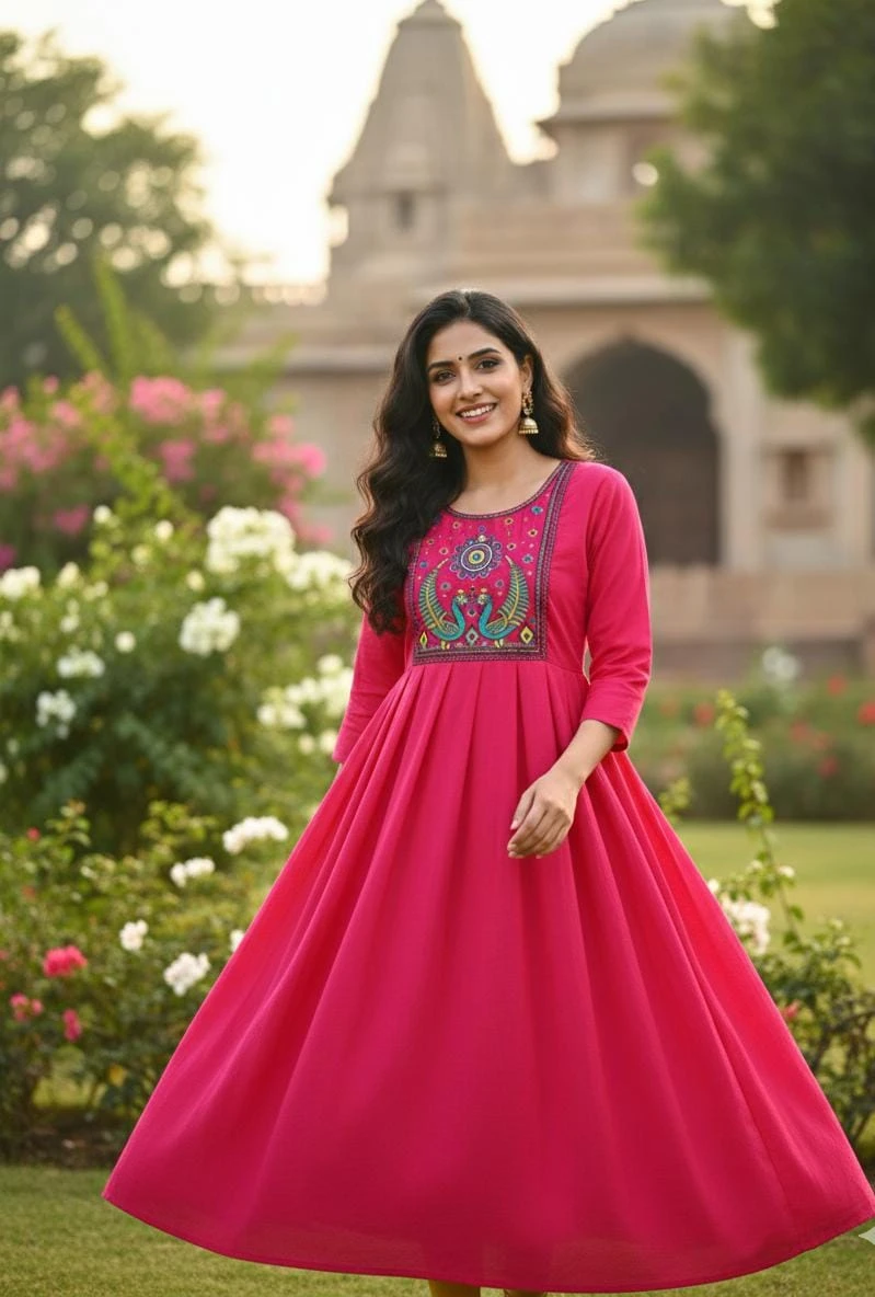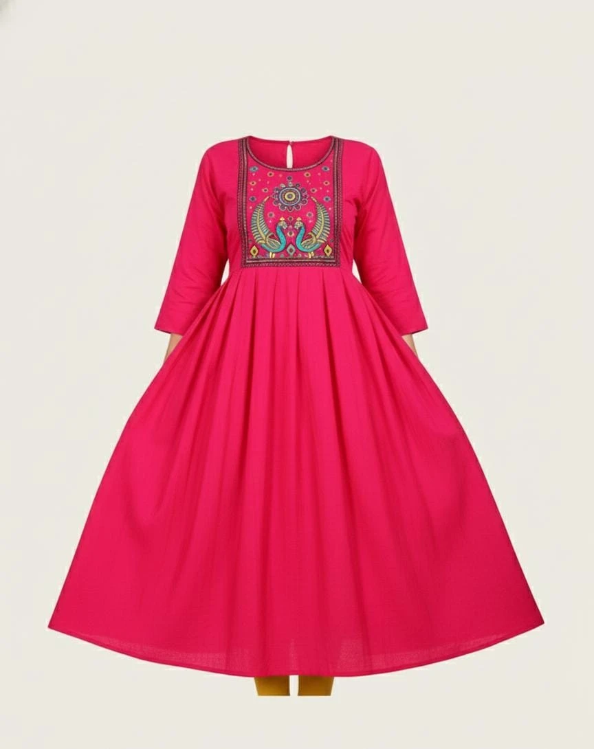 Make a graceful style statement with this fuchsia pink Anarkali kurti, featuring an eye-catching embroidered yoke adorned with a beautiful peacock motif. Designed with a flattering flared silhouette, this kurti offers elegant movement and all-day comfort. The three-quarter sleeves and classic round neckline enhance its timeless appeal, making it perfect for festive occasions, cultural events, or elegant day wear. Pair it with contrasting leggings and traditional jewellery for a vibrant, refined look.