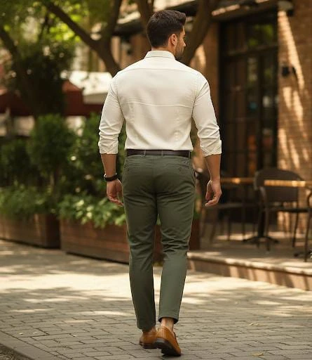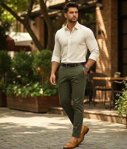 Step into refined elegance with this stylish men’s outfit featuring an ivory linen shirt paired with olive green tailored trousers. The linen shirt is crafted for breathability and all-day comfort, offering a crisp, clean look that’s perfect for warm days and polished occasions. The well-fitted trousers enhance the silhouette, making this combo ideal for office wear, business casual events, brunches, or evening outings. A timeless ensemble that blends comfort, versatility, and modern sophistication.