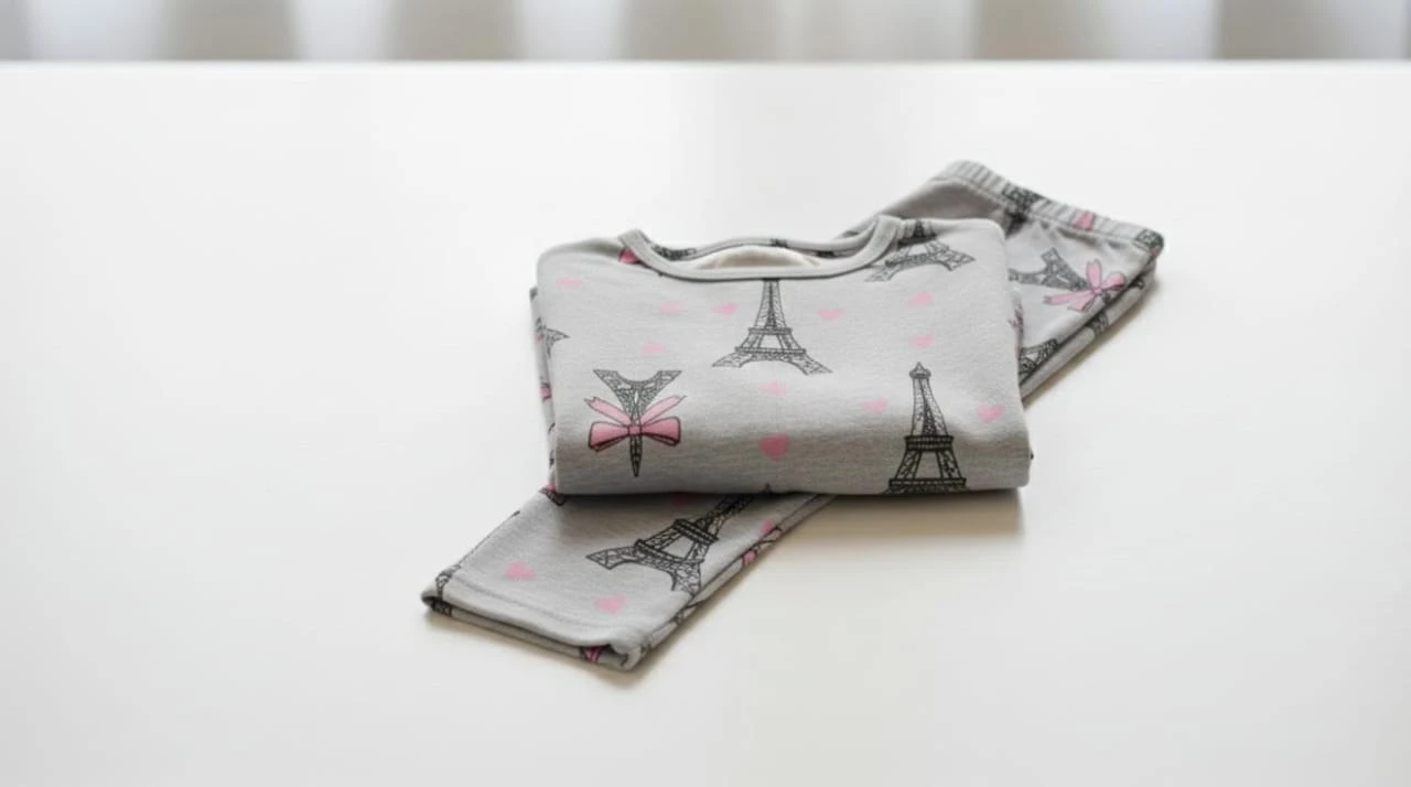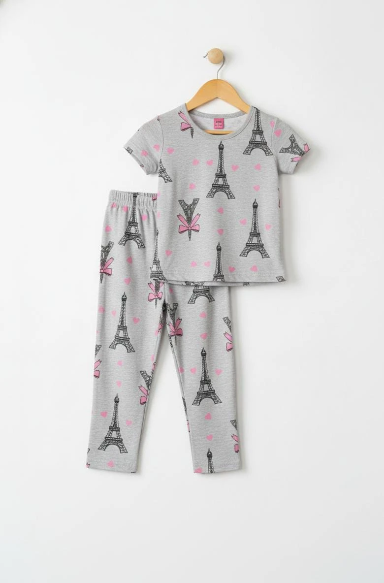 A soft and comfortable grey nightwear set featuring cute Eiffel Tower, bow, and heart prints, perfect for cozy sleep and everyday lounging.