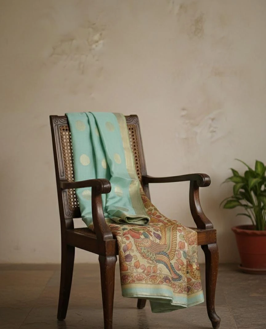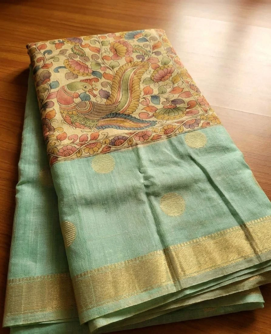 It features a Kalamkari-style peacock and floral design in rich earthy colors, finished with a traditional printed border that adds elegance.