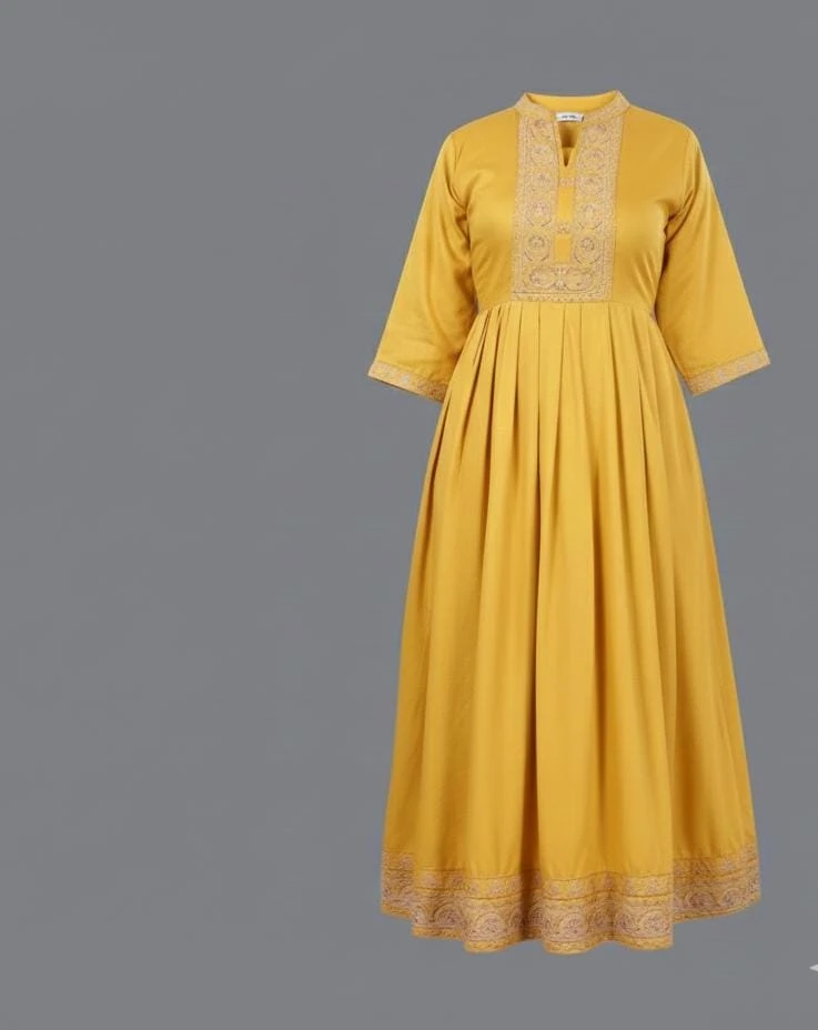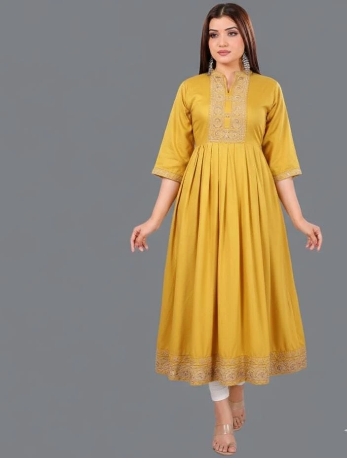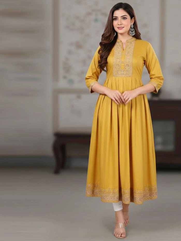 Brighten your ethnic collection with this stunning mustard yellow Anarkali kurti, crafted with a beautifully embroidered yoke that adds a touch of traditional elegance. The softly flared silhouette offers graceful movement, while the three-quarter sleeves and subtle neckline detailing ensure a refined finish. Accented with a delicate border at the hem, this kurti is perfect for festive occasions, office celebrations, or casual gatherings. Pair it with leggings or palazzos and statement earrings for a classy, timeless look.
