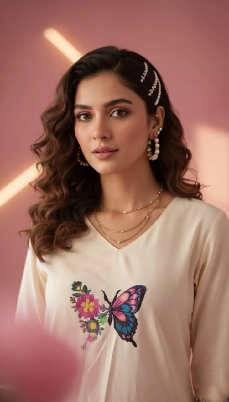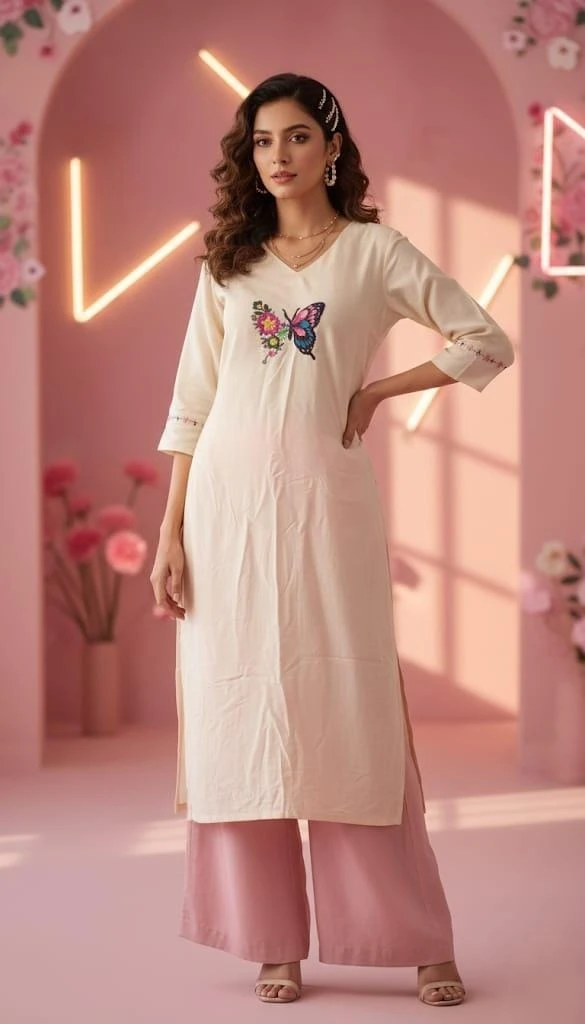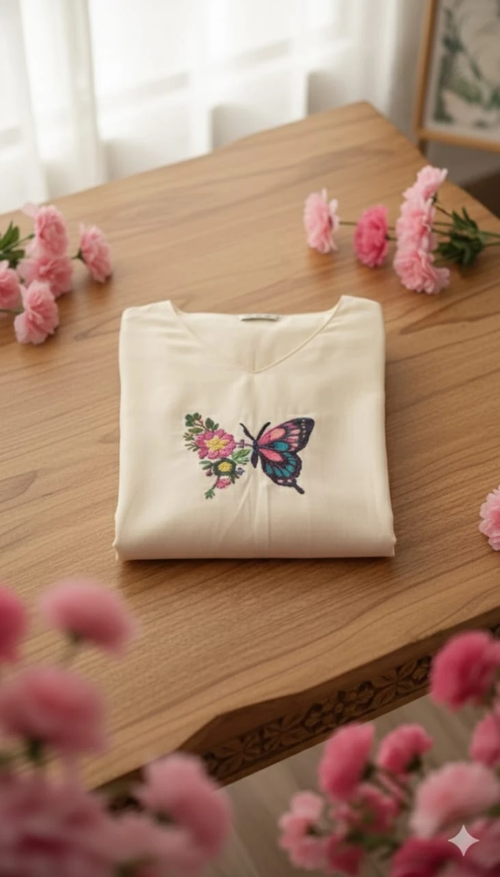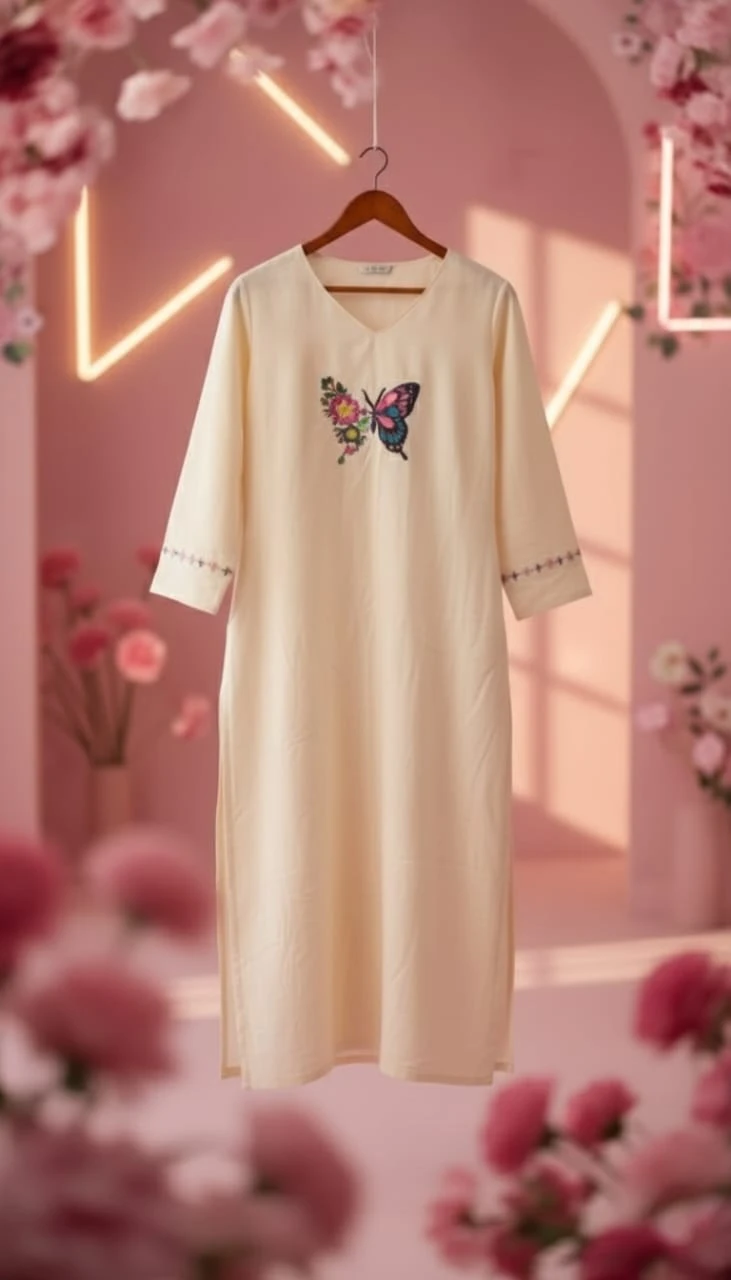 Grace your look with this NEXO PRO handcrafted embroidered kurta set featuring elegant butterfly hand embroidery and a soft pastel palette.