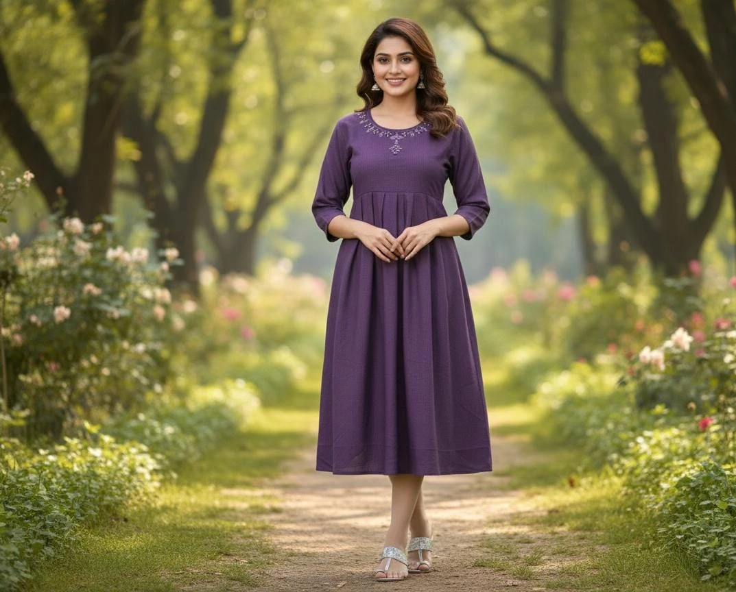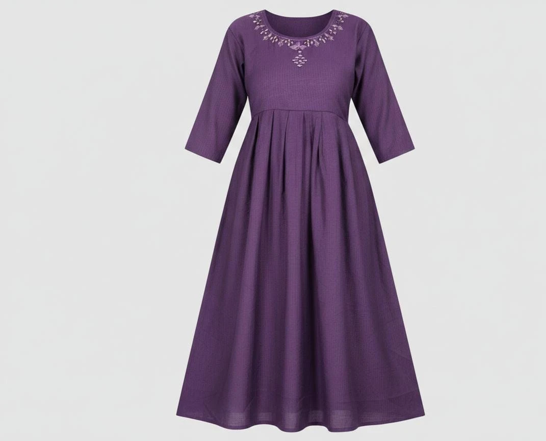 Keep your look effortlessly elegant with this plum purple solid flared dress, designed with subtle embellishment around the neckline for a refined finish. The softly gathered waist creates a graceful silhouette, while the three-quarter sleeves ensure comfort and versatility. Perfect for casual outings, daytime events, or relaxed festive wear, this dress blends simplicity with timeless charm. Style it with minimal jewellery and flats or heels for a polished, graceful appearance.
