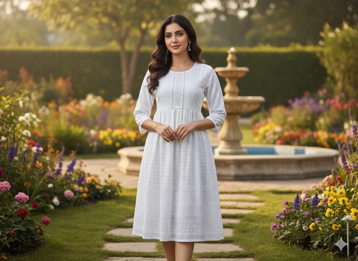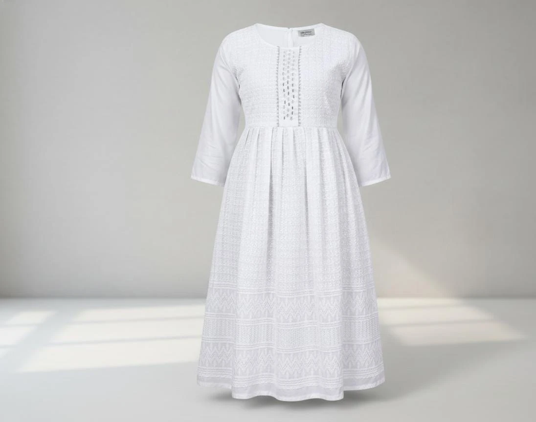 Embrace effortless elegance with this pure white Anarkali dress, beautifully crafted with delicate embroidery and a refined pintuck yoke. The softly gathered waist flows into a graceful flared silhouette, while the three-quarter sleeves add a touch of classic charm. Perfect for festive occasions, summer gatherings, or serene day outings, this dress offers a timeless, sophisticated look. Style it with subtle jewellery and sandals for an understated yet graceful ensemble.