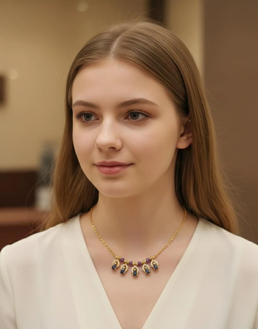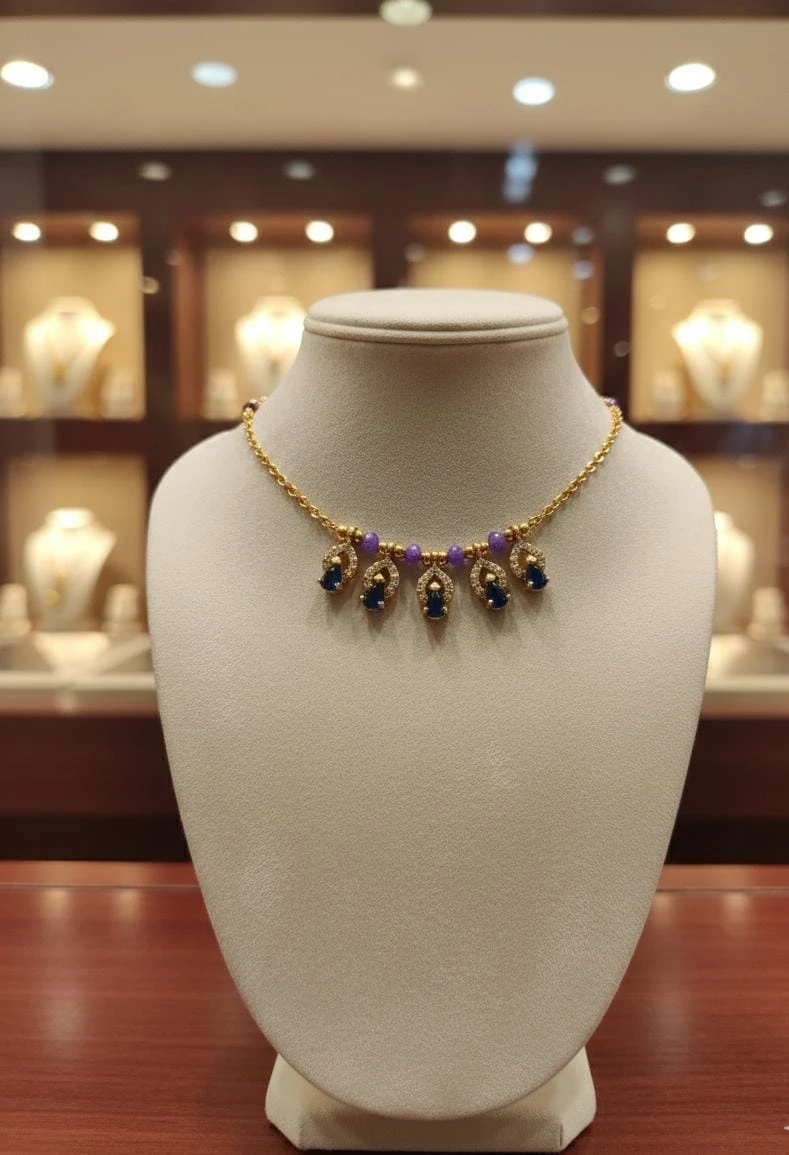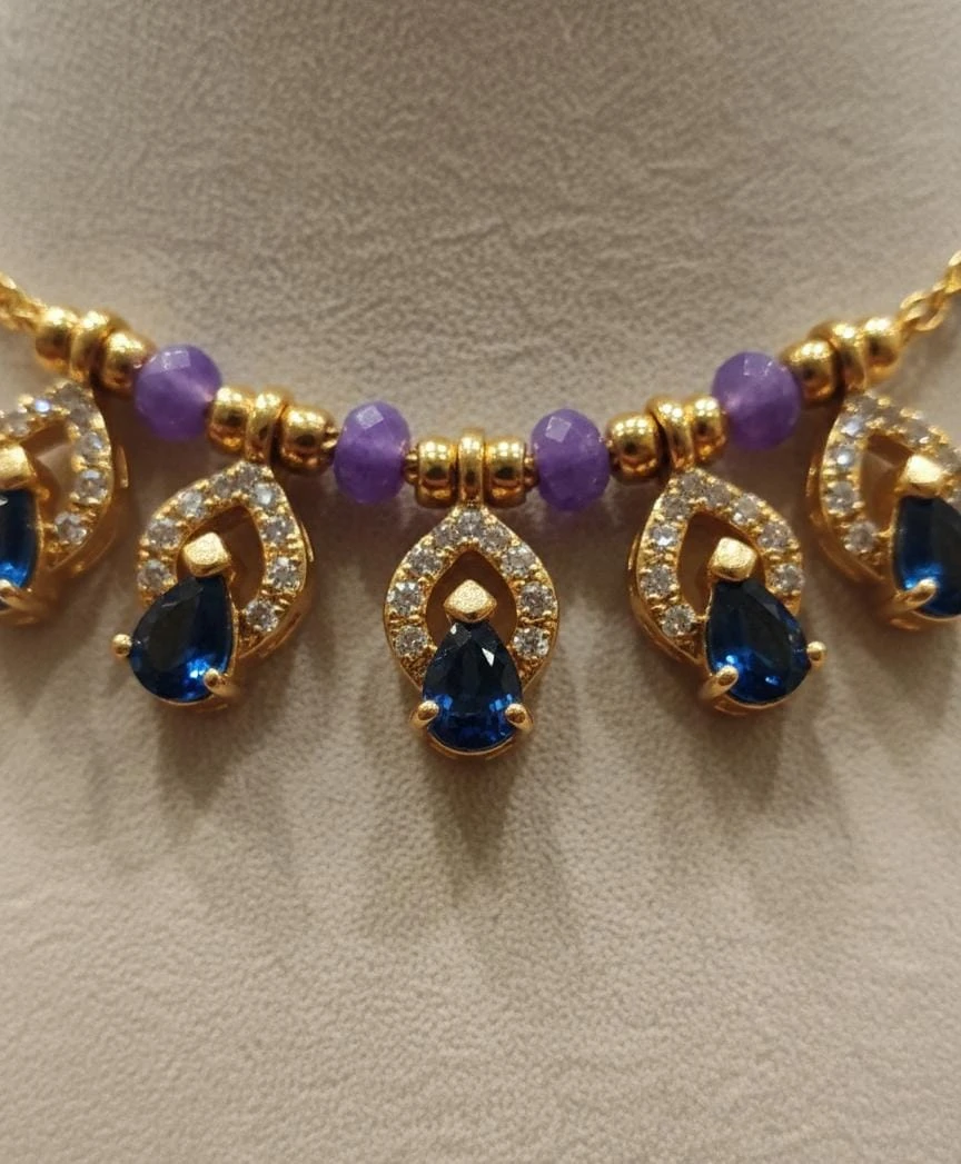This elegant necklace showcases deep royal blue teardrop stones paired beautifully with soft amethyst-tone beads, set on a classic gold-finish chain. The delicate drop design with subtle crystal accents adds a refined sparkle, making it perfect for festive occasions, parties, and traditional wear. Lightweight yet eye-catching, this necklace complements sarees, lehengas, and fusion outfits with effortless grace and timeless charm.