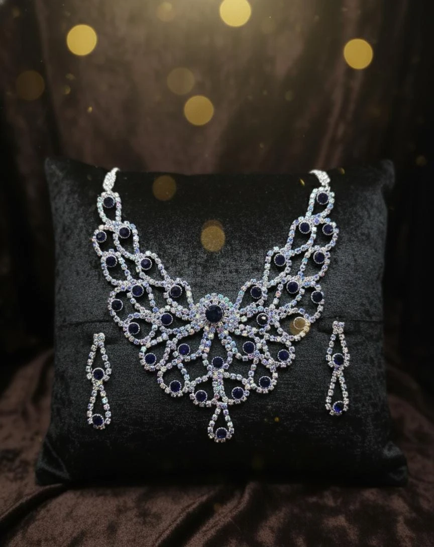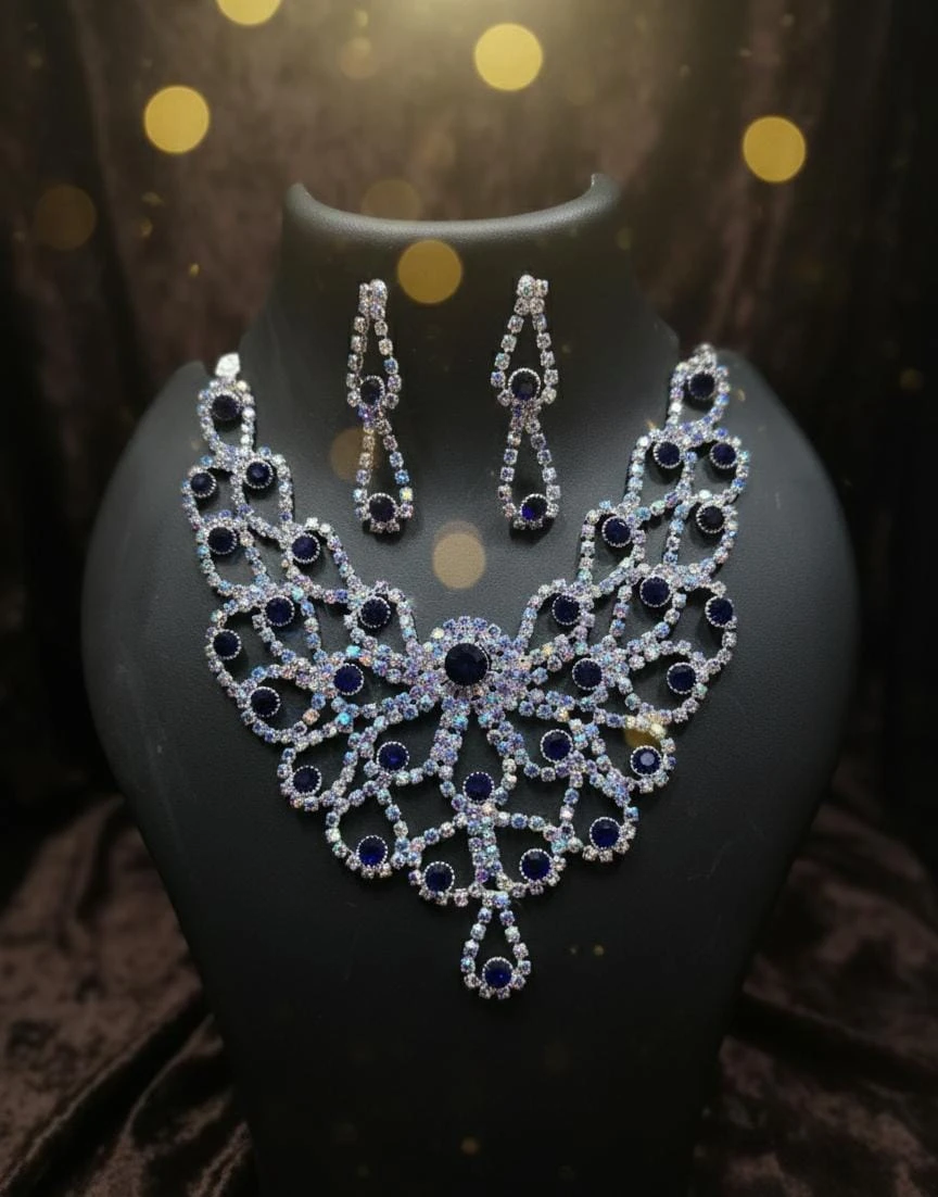 An elegant statement necklace with deep blue stones and sparkling crystal detailing, paired with matching drop earrings. Perfect for weddings, parties, and premium ethnic wear looks.