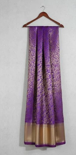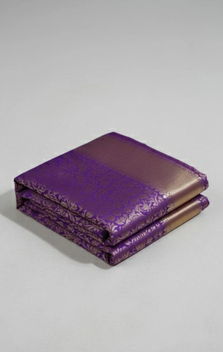 Exuding timeless elegance, this royal purple silk saree is adorned with intricate all-over woven motifs and finished with a rich antique gold zari border. The luxurious sheen of the fabric and the beautifully detailed pallu create a regal look, perfect for weddings, festive occasions, and grand celebrations. Drapes gracefully and pairs effortlessly with traditional gold jewelry for a classic, sophisticated appearance.