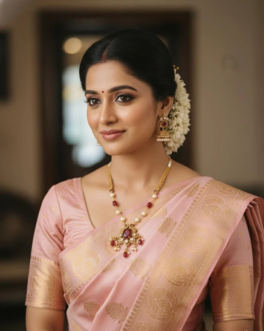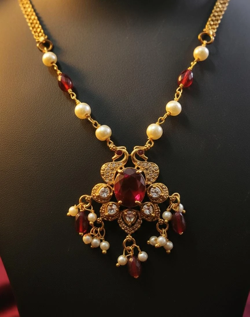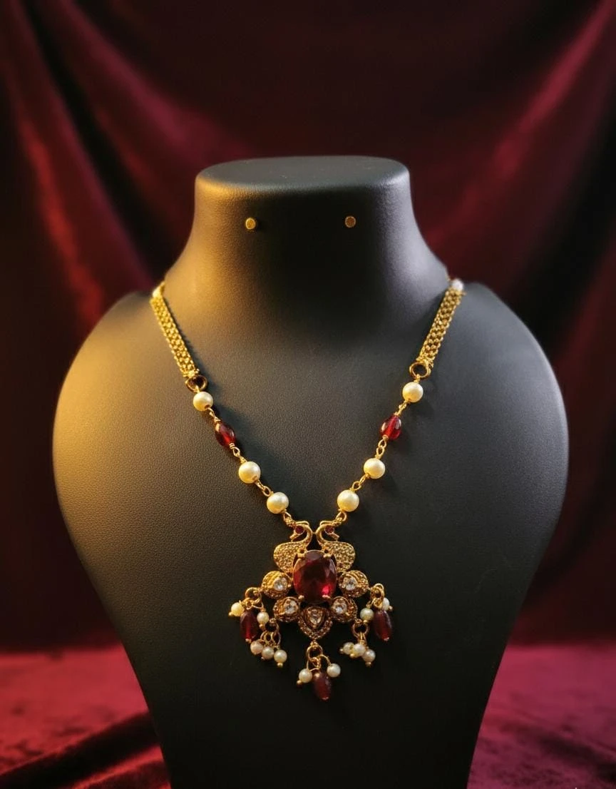 This elegant antique-style necklace features a stunning ruby-red centerpiece set in a rich gold-tone design. Adorned with delicate white pearls and deep red beads along the chain, it showcases intricate craftsmanship inspired by traditional royal jewellery. The floral pendant with dangling pearl and ruby accents adds graceful movement and charm, making it perfect for weddings, festive occasions, and ethnic wear. A timeless piece that enhances sarees, lehengas, and traditional outfits with a luxurious touch.