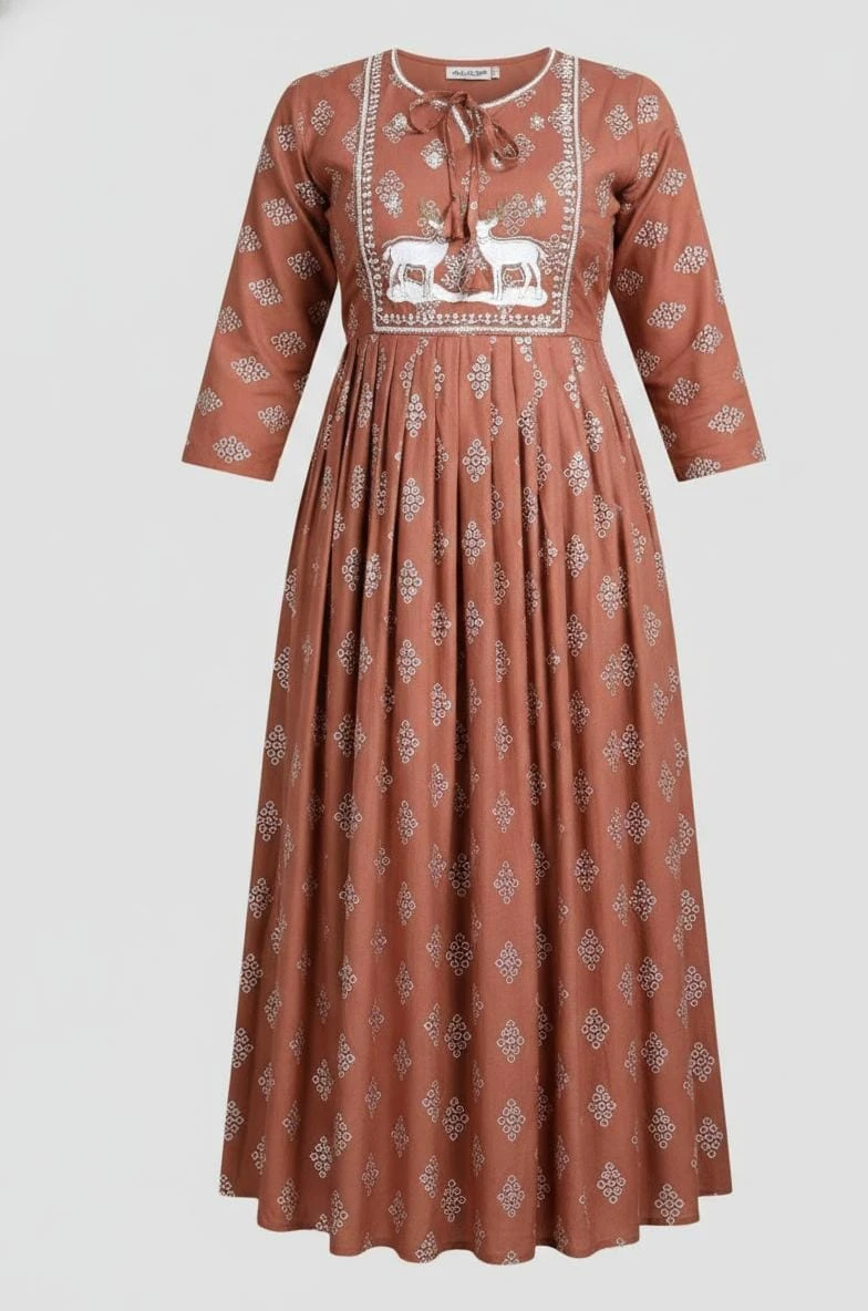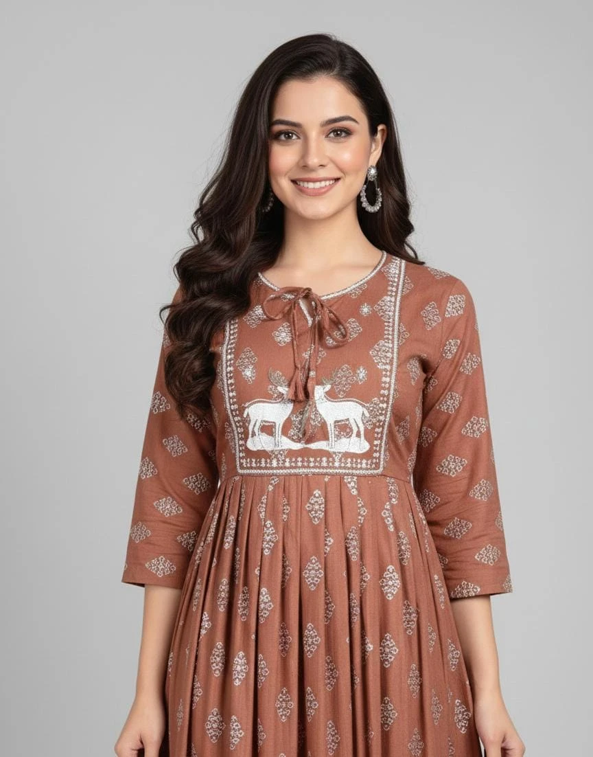Embrace earthy elegance with this rust brown Anarkali kurti, beautifully adorned with delicate all-over prints and a charming elephant motif on the yoke. Designed with a flattering flared silhouette, it features a tie-up neckline and three-quarter sleeves for a graceful, comfortable fit. The traditional detailing adds a cultural touch, making this kurti perfect for festive occasions, casual gatherings, or ethnic day wear. Style it with minimal accessories and flats for a timeless, elegant look.