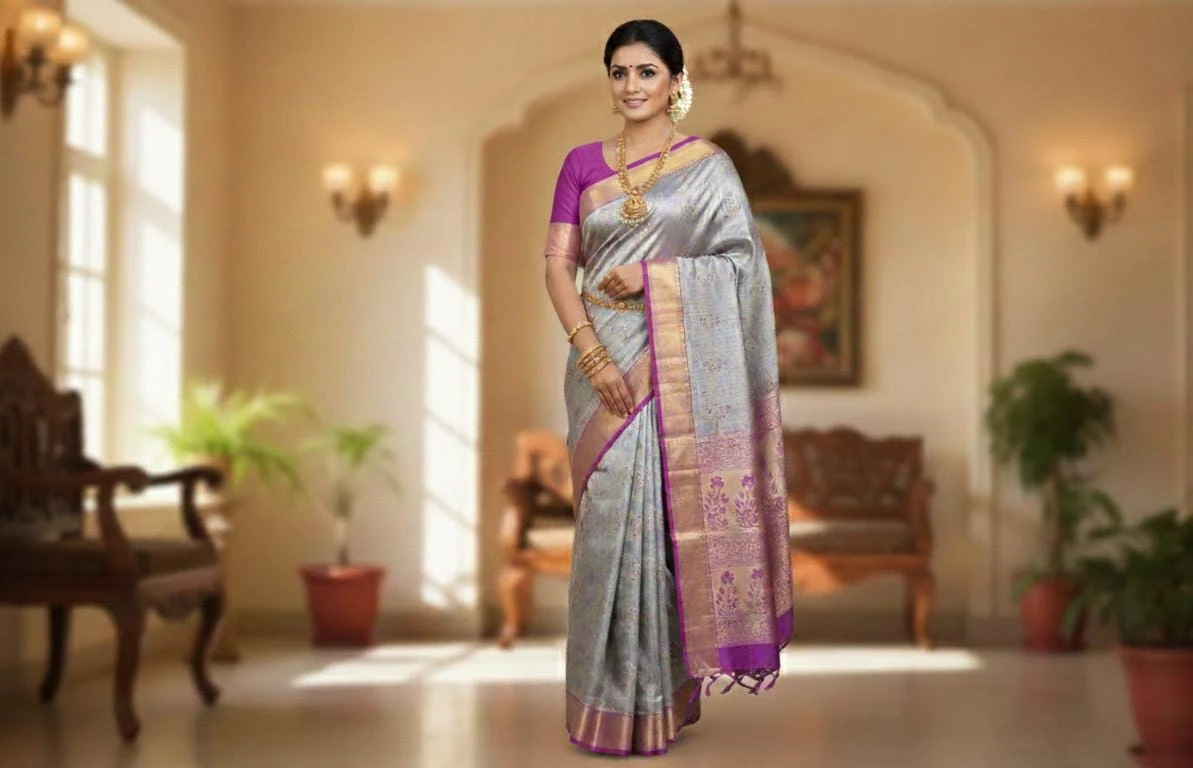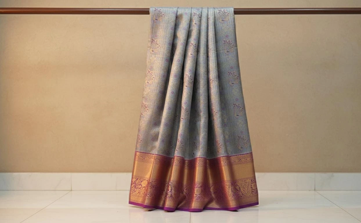 This saree is a classic, no-nonsense Kanchipuram silk piece in an elegant silver grey base, detailed with subtle woven motifs throughout. The rich antique gold zari border with a bold purple edge adds contrast and authority—this isn’t flashy, it’s refined. The pallu carries traditional zari work that elevates the drape without overpowering it. Best suited for weddings, festive functions, temple events, and formal ethnic occasions. Pair it with a solid purple blouse and gold jewellery—anything extra will only dilute its impact.