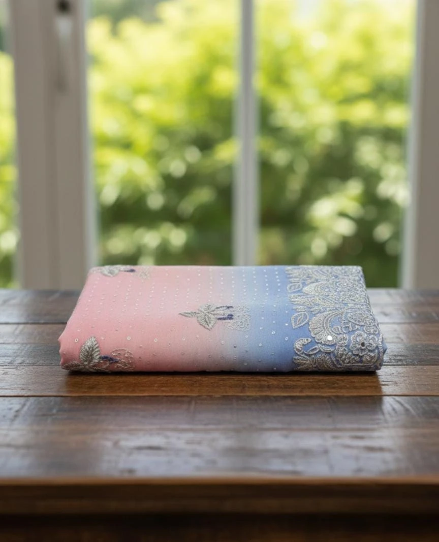 Elegant double-shaded tissue saree with heavy big border and fine thread work, perfect for parties and special occasions.