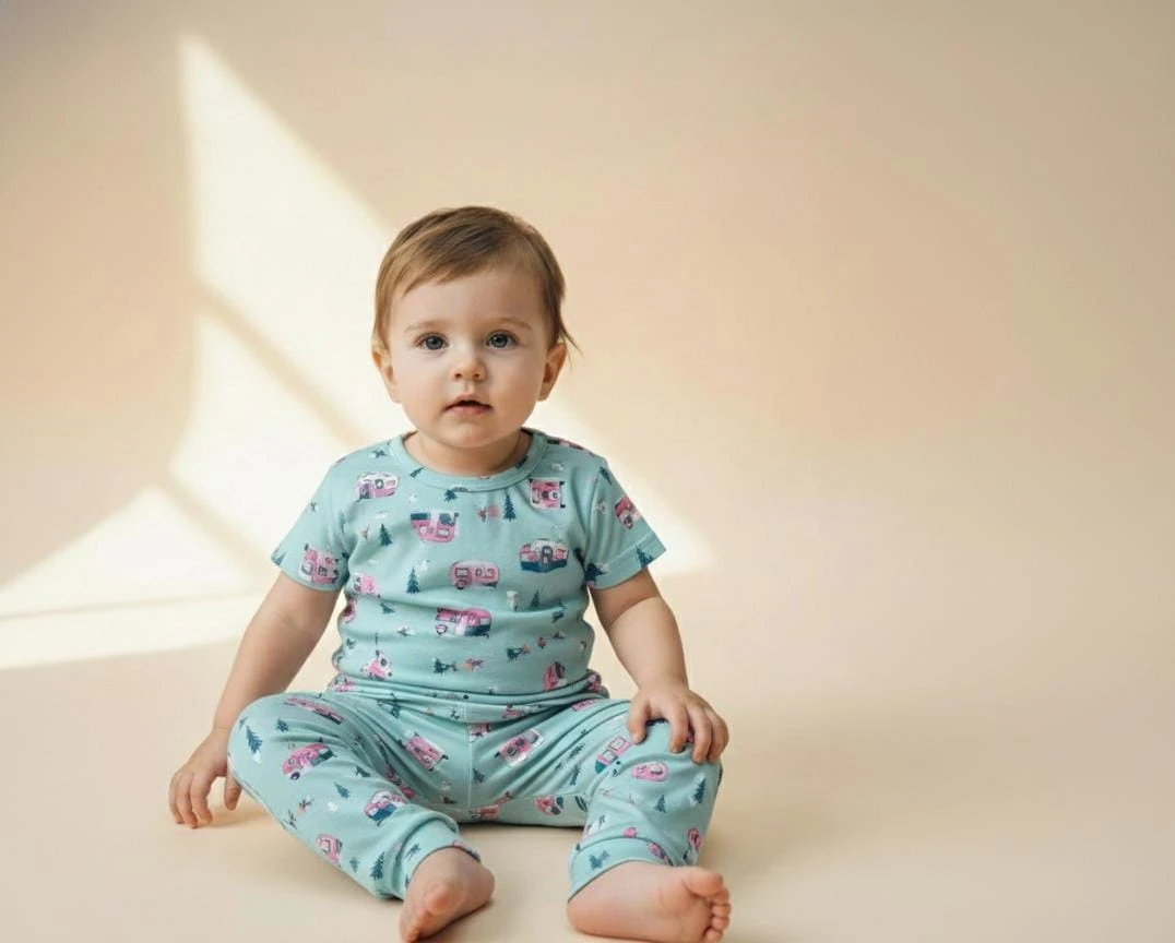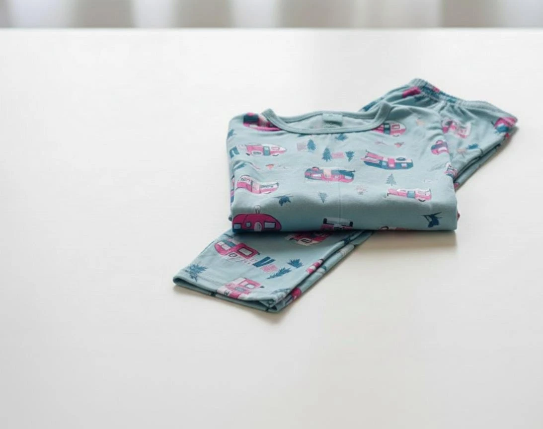 A soft and breathable sky-blue nightwear set featuring cute camper van and nature prints, designed for cozy sleep and playful comfort.